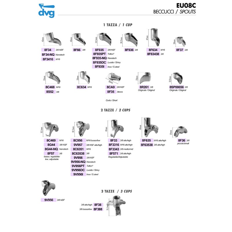 8F935 SINGLE COFFEE SPOUT TOTALLY OPEN 3/8-LOW NSF New chroming process certified NSF/ANSI51. Suitable Spaziale, Wega, Aurora, etc. Go back Request info Warning! To make an order by using our Web Site and to check out our items, You need to get an account. Login Sign up